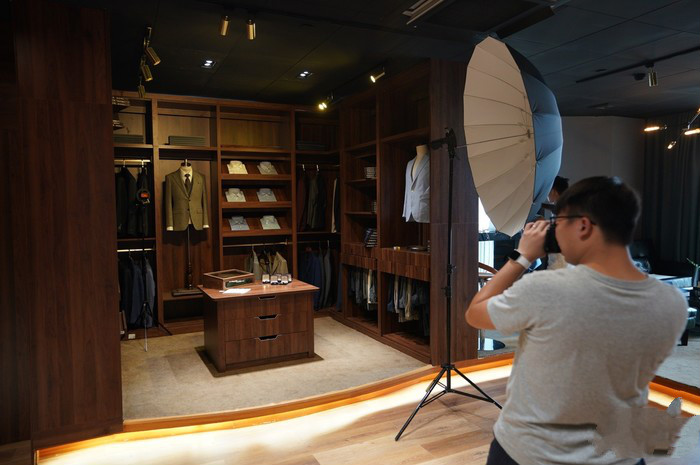 使用索尼HVL-F60RM作为主光,结合闪光灯灯具配件接抛物线伞进行拍摄。F60RM的功率我们设置为1/2输出。这次拍摄的西服+深色系环境,使用HVL-F60RM+抛物线伞的目的是让模特的整体立体感更强,光线的光强渐变弱更显层次。
