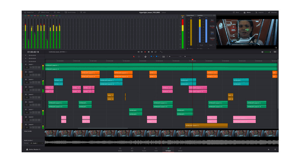 DaVinci Resolve 15还对Fairlight音频页面进行了大量更新。Fairlight页面现在有一个完整的ADR工具集、静音和可变音频重定时音调校正、音频标准化、3D平移器、音频和视频滚动器、带滚动时间线的固定播放头、均衡器预设库、动态、插件和全局轨道属性 、共享声音库、以及内置的跨平台插件,如混响、哼声消除、人声通道和消除器。 借助于DaVinci Resolve 15,客户在Mac、Windows和Linux之间移动时不再需要担心音频插件,因为FairlightFX插件可在所有三个平台上本机运行。