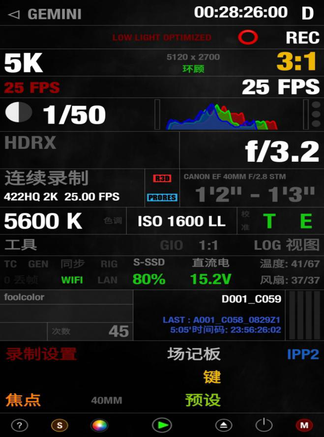 如果你是一个RED用户,对上方这个界面肯定非常熟悉。 在这个界面,你可以快速改变压缩比、帧速率、快门速度或者开角度、白平衡等等,也可以把最常用的设置存储为预设。对于摄影机硬件的物理按键,APP 上也可以进行虚拟操作。 其他 APP 上没有显示的功能,可以点击右下角的M键进入菜单。
