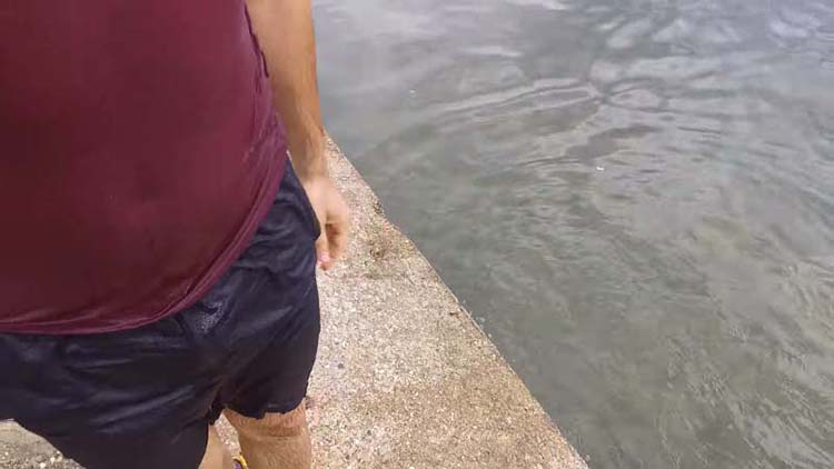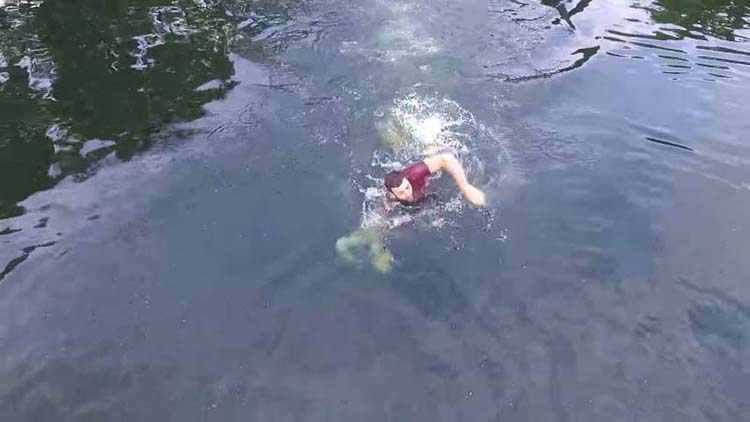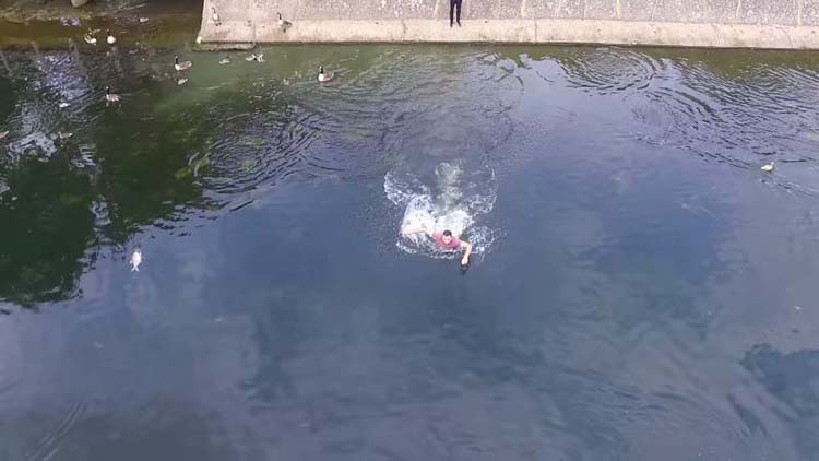 ▲▼ Dave Svorking跳入湖中,并以自由式向无人机下堕方向游去