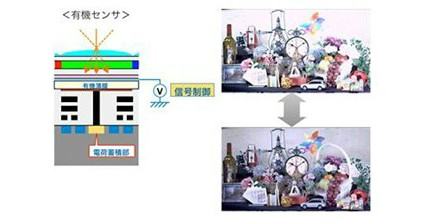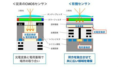 新开发的有机传感器实现了层叠结构,其中通过使用用于光电转换部分的有机薄膜将电荷累积部分布置在下层中。每个结构完全独立,光电转换和电荷累积都是有效兼容的。首先,在光电转换部分中,光接收部分的面积被扩大,实现了对应于对比度差的宽动态范围。例如,即使在亮度差异很大的场景,例如体育场中强烈的灯光光线和观众座位阴影,也可以以8K高分辨率进行拍摄。