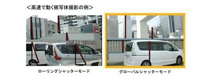 通过增加电荷累积和读出效率,可以安装同时曝光所有像素的全局快门。这使得可以在滚动快门模式(在高速移动物体中发生歪斜失真的现象),闪光带(在上部和下部发生明暗差异的现象)中执行精确成像而没有歪斜。