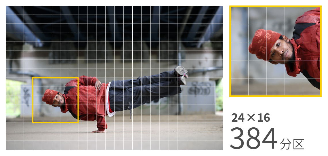 EOS R6 Mark III在评价测光时将画面分割成384区(24 × 16)进行测光,曝光精度高。相机还具备自动对焦时针对所识别的被摄体确定曝光的功能。可基于自动对焦所识别被摄体的亮度计算曝光。连拍时如果画面中的被摄体有大幅的移动,相机可根据追踪被摄体过程中所用对焦点位置的亮度情况计算曝光。提升了连拍时每张照片的曝光精度。