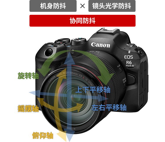 ※2 使用电子快门,搭配RF24-105mm F2.8 L IS USM Z时,105mm焦距,俯仰轴、摇摆轴及旋转轴方向。基于CIPA2024测试标准。