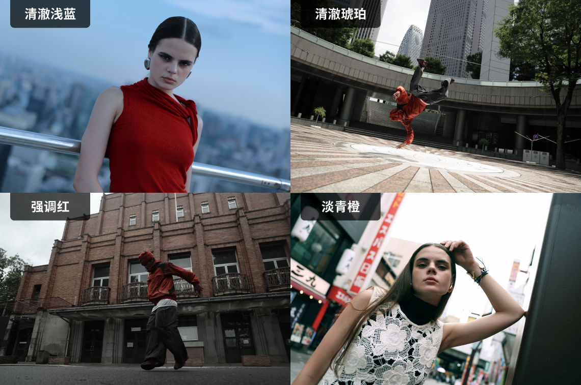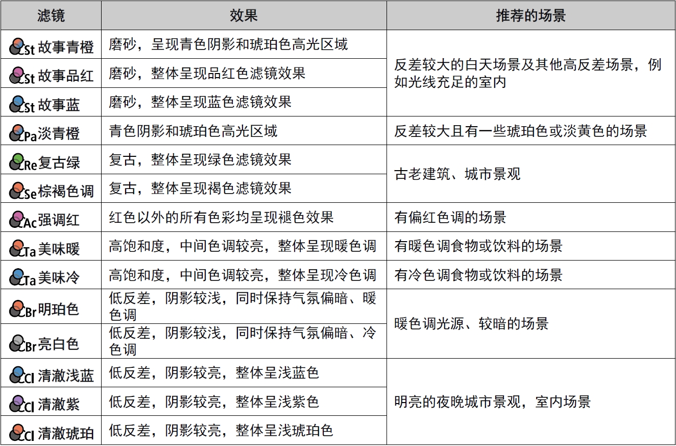 色彩滤镜有故事青橙、故事品红、故事蓝、淡青橙、复古绿、棕褐色调、强调红、美味暖、美味冷、明珀色、亮白色、清澈浅蓝、清澈紫、清澈琥珀,共14种滤镜可选,照片和视频拍摄都可以使用。拍摄时可实时确认画面效果,并根据需要选择使用,轻松获得个性化的视频效果。