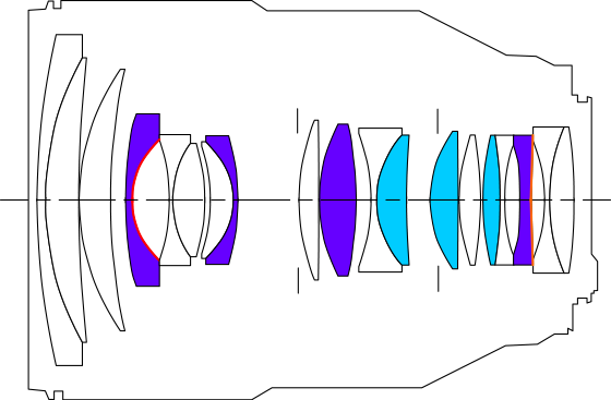 非球面镜片是为补偿多种像差而设计制造的特殊镜片,它通过调节镜片表面的曲率从而控制入射光线的方向将像差抑制在较低水平。因此可以提高大光圈镜头的性能,还能让广角变焦镜头设计得更广角。另外在变焦镜头的小型化等方面,非球面镜片也起到了很大作用。