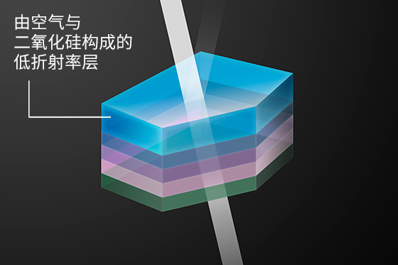 在镜片表面覆盖了包含二氧化硅与空气的具有低折射率的ASC(Air Sphere Coating)镀膜,和在镜片表面排列众多纳米级楔形结构的SWC亚波长结构镀膜,可有效抑制入射角较小的正面受光和入射角较大的侧面受光造成的反射。这两项镀膜技术可以有效地抑制鬼影和眩光的产生。